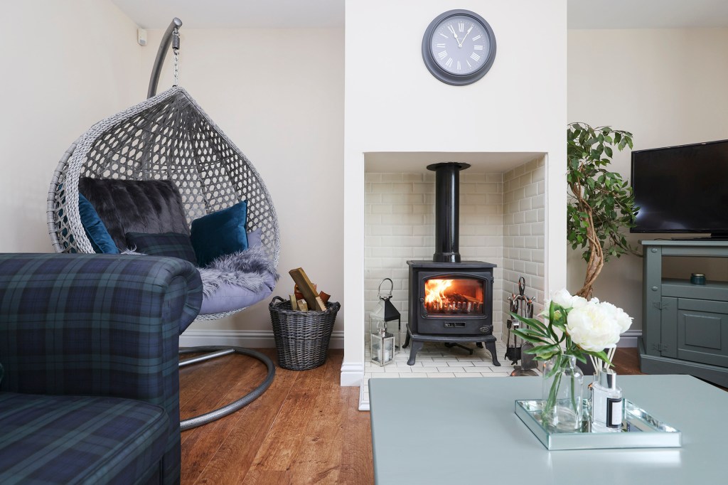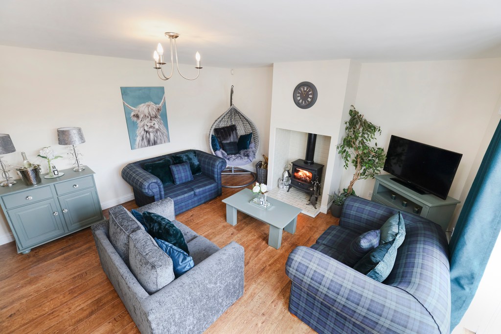 - Living room, log burner, TV and Sky